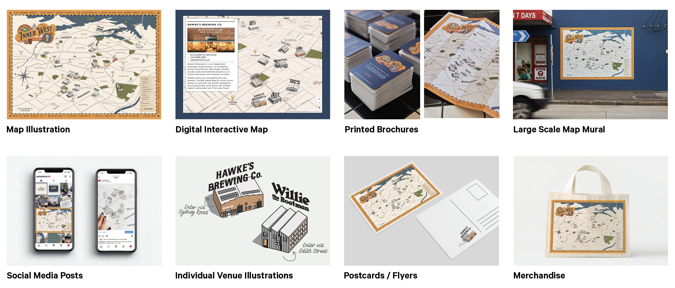 Peita has created a diverse range of maps for a range of clients for tourism bodies, property developers, cultural organisations, small businesses, corporations, councils, and publications, showcasing her ability to tailor her work to different audiences and purposes.